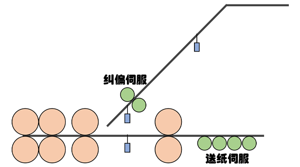 高速裱紙機運動控制器部分方案,主要控制面紙糾偏和送底紙功能,根據5個高響應光電進行位置信號采集,通過位置疊加和凸輪功能執(zhí)行需求動作。